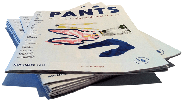 Pants Magazine is a publication concerning bifurcated garments, etc., which explores pants and pants-related things, literal and figurative. Once you start thinking about it, most things in the world are related to pants, even tangentially.
